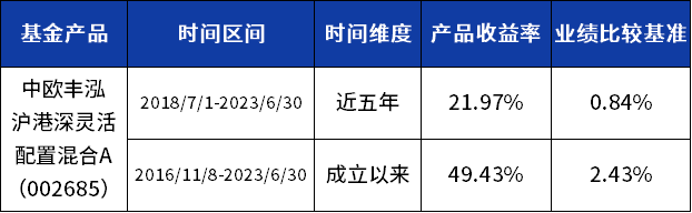 中欧丰泓沪港深灵活配置混合A的成立以来涨跌幅49.43%, 同期业绩比较基准2.43%。2018-2022年基金涨跌幅和同期基准表现为-16.15%/-14.01%,43.53%/21.49%,35.86%/14.65%,10.54%/-9.5%,-22.22%/-12.82%。历任基金经理:沈悦20200731-管理至今,罗佳明20190702-管理至今,曲径20171117-20190702,卢博森20161230-20200731,曹名长20161108-20210210。本产品于2020/10修改投资范围,增加存托凭证为投资标的。详阅法律文件。业绩比较基准为中证港股通综合指数收益率*55%+沪深300指数收益率*35%+中证短债指数收益率*10%。中欧丰泓沪港深灵活配置混合A为混合型基金,其预期收益及预期风险水平高于债券型基金和货币市场基金,但低于股票型基金。本基金可投资于港股通标的股票。除了需要承担与内地证券投资基金类似的市场波动风险等一般投资风险之外,本基金还面临港股通机制下因投资环境、投资标的、市场制度以及交易规则等差异带来的特有风险。基金名称仅表明基金可以通过港股通机制投资港股,基金资产对港股标的投资比例会根据市场情况、投资策略等发生较大的调整,存在不对港股进行投资的可能。
