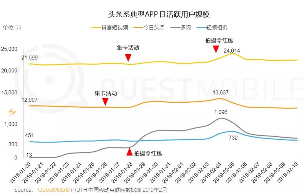 下载量之外再看日活。2 月 4 日除夕夜,多闪日活突破 1000 万,达到历史最高点,但随后又快速回落至 300 万左右的水平,仅高于头条旗下的轻颜相机。