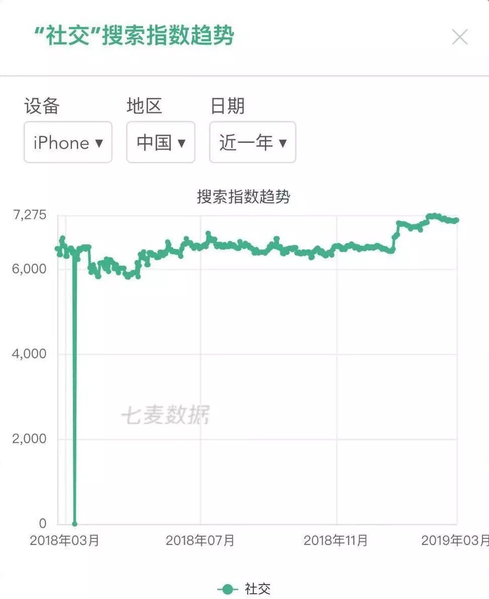 据有关数据表明,现在移动网民日均 App 的使用时长已经超过 4 个小时。在这 4 个小时中,社交类 App 以超过 90 分钟的使用时长占据榜首,数据还在持续上涨当中。而在七麦数据上,从关键词“社交”近一年的搜索指数来看,社交热度年均稳定在 6000 以上,用户对于社交类 App 的关注度较高。