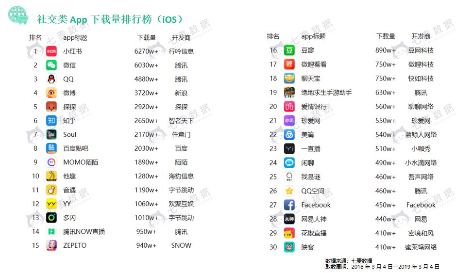 根据七麦调取出的社交类 App 下载量排名 Top30 中(取数周期为近一年),【小红书】、【微信】、【QQ】、【微博】、【探探】依次位列前五。一共有 13 款 App 下载量超千万,其中头条系产品表现最为亮眼,【音遇】和【多闪】也是仅有两款于 2018 下半年上线,iOS 下载量就超千万的 App。紧随其后的【ZEPETO】表现也不错。