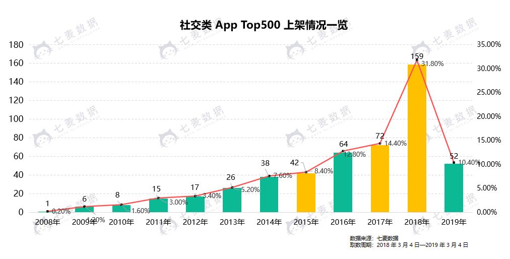 而在 2019 年前两个月,App Store 新上架 53 款社交类 App。七麦猜测今年社交产品的上架数量仍会持续上涨,有超过 2018 年的趋势。