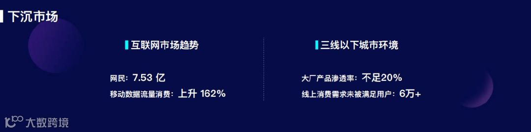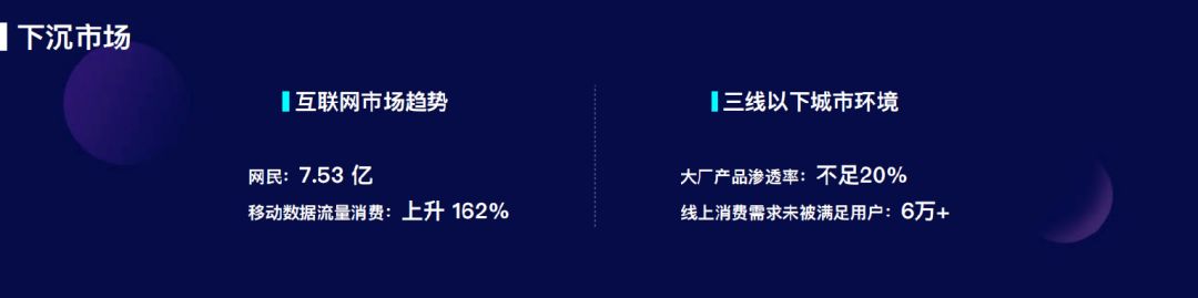 2018 年 5 月 31 日发布的《互联网趋势报告》中称“中国网民人数已经超过 7.53 亿,占到总人口的一半以上,移动数据流量消费同比上升 162%。”而在三线以下城市,BAT 和头条系的产品的渗透率一直没有超过 20%。也就是说除去一二线城市用户,有将近 6 万的用户群体的线上消费需求没有被很好的满足。
