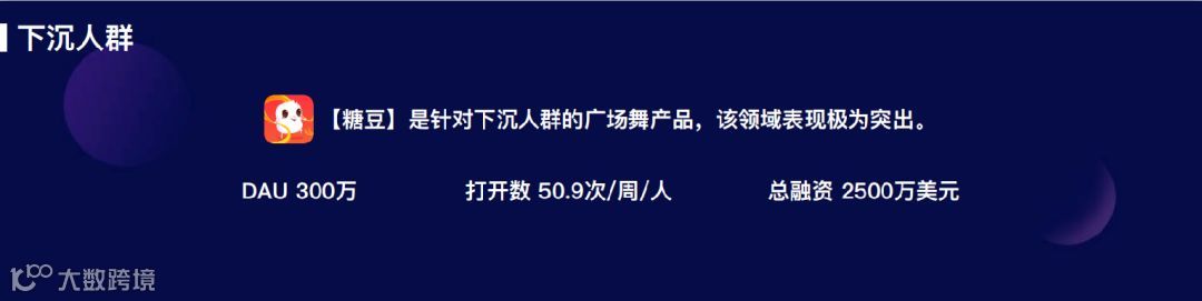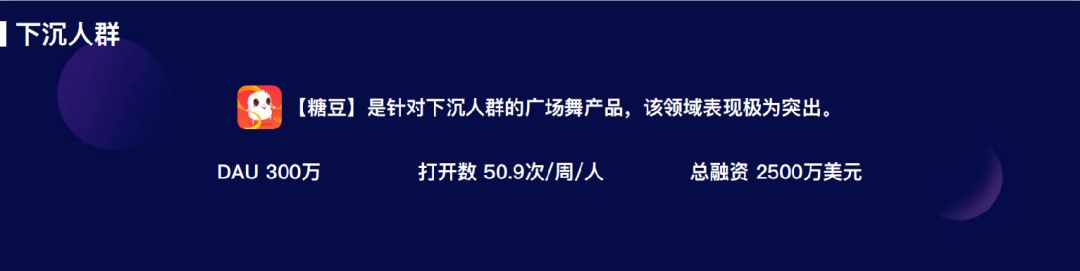 2017 年 9 月上线的糖豆,主打全民广场舞视频社区,跳广场舞的大妈也是三四线城市中不可忽视的一部分群体。