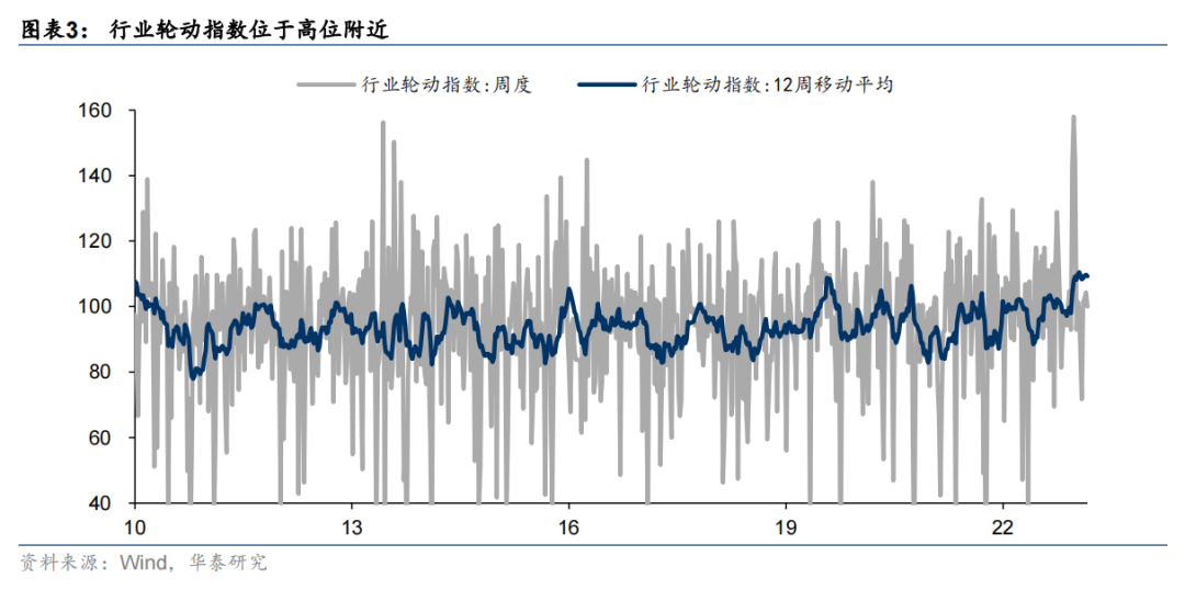 从行业轮动指数来看,板块轮动的强度已经达到了2010年以来高位。