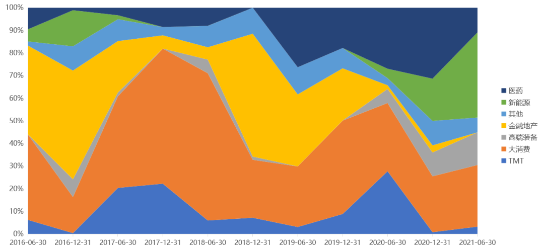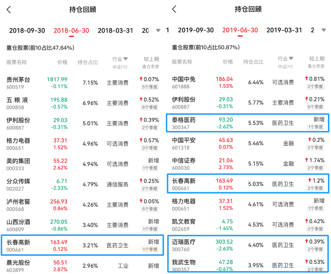 他最具代表性的一次行业切换是2019H1,钱亚风云减仓消费、加仓医药。
