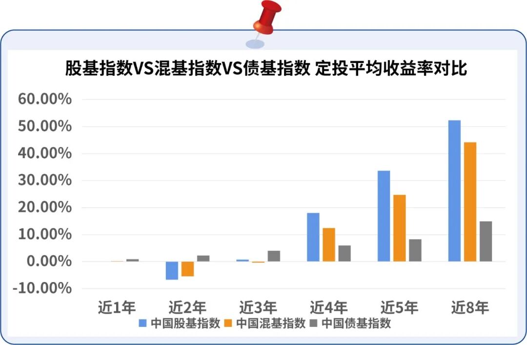 其实,几乎所有类型的基金都可以做长期定投,不过,波动越大的基金,定投越长时间,平滑成本、争取收益的效果越明显。数据显示,以近8年时间维度测算,中国股基指数(CN6070.SZ)、中国混基指数(CN6071.SZ)与中国债基指数(CN6072.SZ)的定投收益率如下: