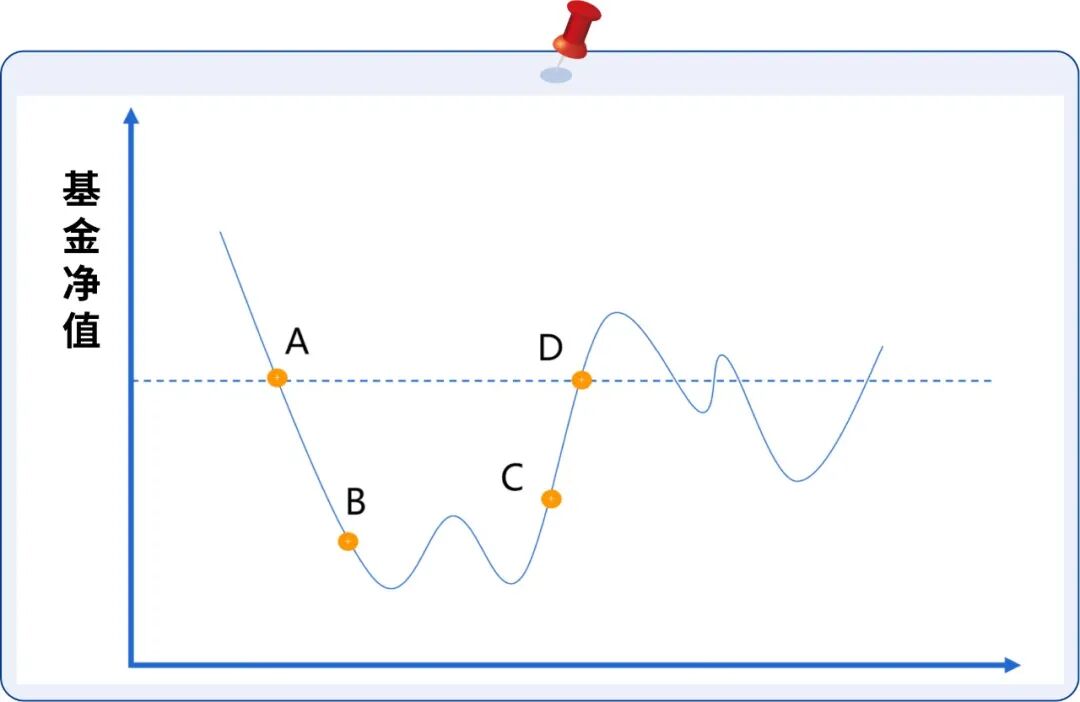 若在A点买入,B点、C点仍继续定投,则此时成本单价会被拉低(低于A点),当基金净值回到D点时,已经有了正收益。
