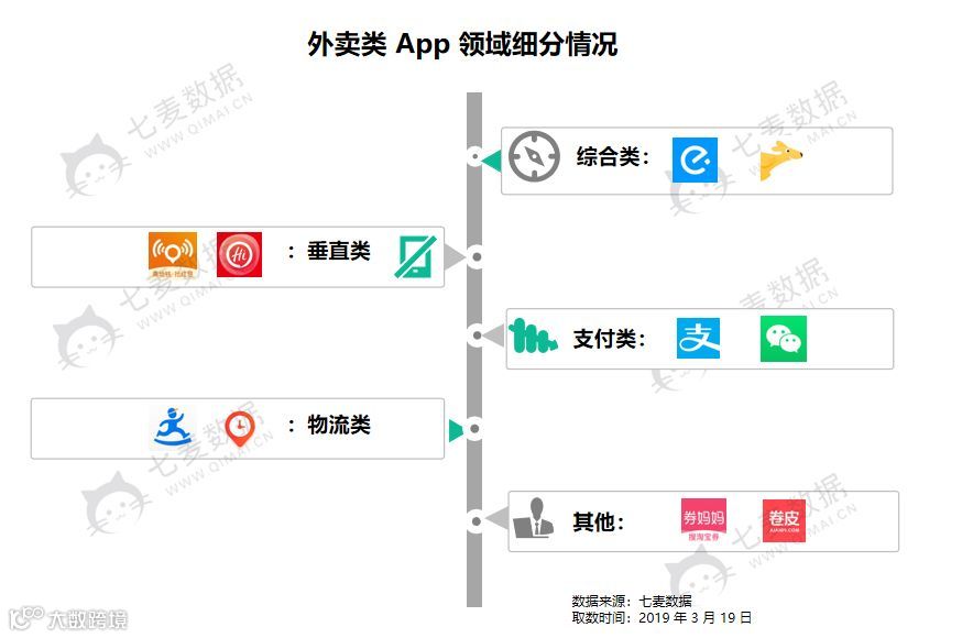 在 App Store 中,外卖类 App 种类繁多,大致可分为以下五类:综合类、垂直类、物流类、支付类,其他。从最初的综合类 App 衍生出如【达达】、【邻趣跑腿】这类物流 App;又有如【支付宝】、【微信】这类既是外卖入口,又是支付系统 App 的介入,使得外卖行业逐渐融入到每个人的生活当中。