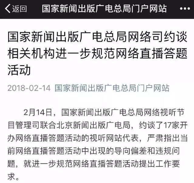 2 月 14 日,广电总局发布声明,要求对网络视听直播答题活动加强管理,并规定未持有《信息网络传播视听节目许可证》的任何机构和个人,一律不得开办网络直播答题节目。