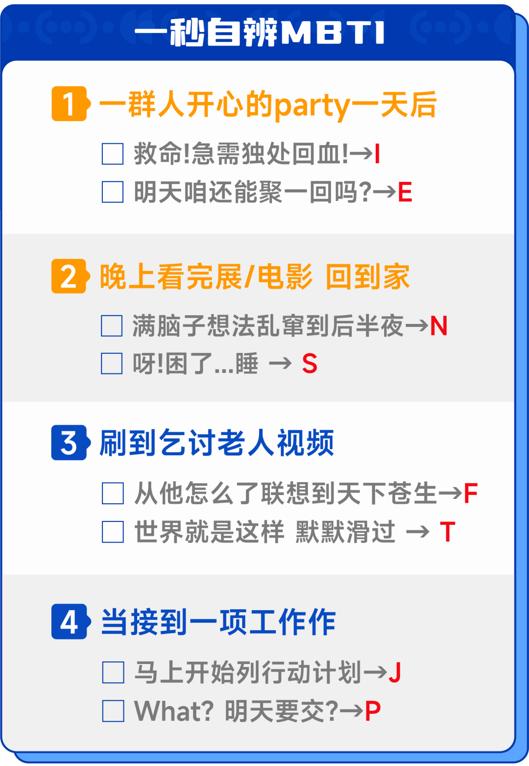 那么,如何判断自己的MBTI呢?欧欧在这里为你提供一份“精简版”测试题,可以简单快速地帮你了解自己的MBTI类型~