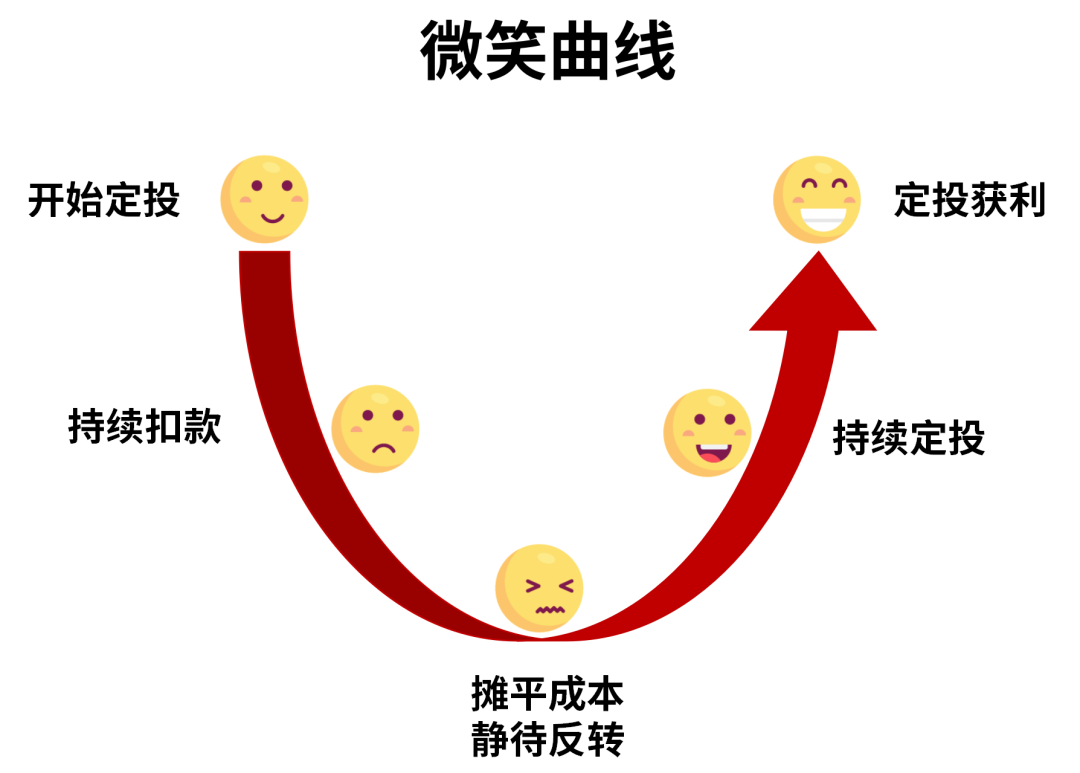我们常说“微笑曲线”,不难看出:当市场下跌时,基金净值会随之降低,这意味着可以用同样的资金买到更多的基金份额。当我们用分批买入的方式不断摊低平均成本,一旦市场开始回暖,进入微笑曲线的右半段,基金净值出现上涨,低持仓成本就能帮助我们快速回本并获利,迎来真正的收益时刻!