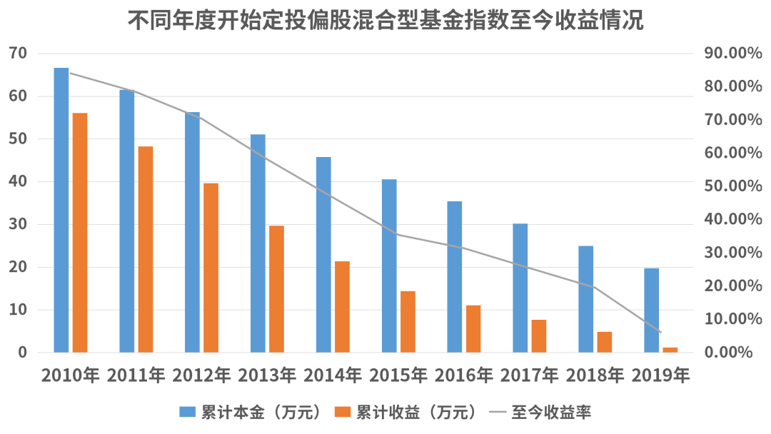假设我们以偏股混合型基金指数作为定投对象,每周定投1000元,计算从2010至2019各年度至今的定投收益率(每年度从3月22日开始计算),可以明显看到定投复利的力量。