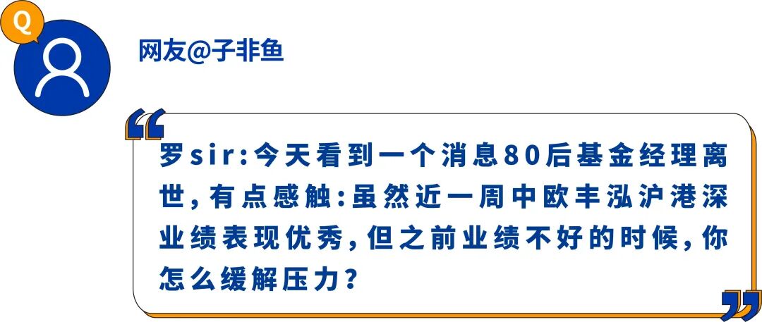 罗佳明:心情不好是肯定的,但也需要积极面对。职业选手不能只在风和日丽时才出海打鱼,而是应该风雨无阻地把事情尽力做好。实际上最影响心情的,是觉得自己辜负了投资人的信任,而信任往往是最难能可贵的。但焦虑是无法解决问题的,我往往会选择出去调研,到“最前线去听炮火”,然后对持仓股票再做一次严格回检。只要能确定所持有的公司在做对的事情,经营稳健且具有较好的自由现金流,每天都在为客户、为社会、为股东创造价值,心里就可以获得一些平静,可以更从容地面对股价的波动。