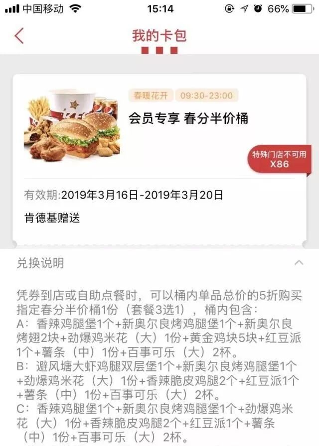 3 月 21 日(春分)前,肯德基推出春分半价桶活动,打开肯德基官方 App 利用神钱包购买,有满 50 再减 20 元优惠,用 35 元就能买到原价 110 的全家桶。对于吃货来讲,简直就是白送。于是一大波人涌入,平台系统崩溃。