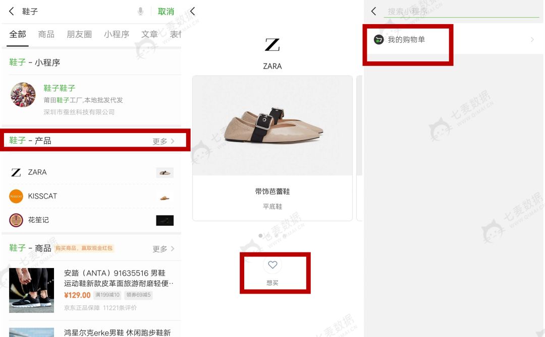 目前「我的购物单」功能需要触发开启,打开搜一搜并搜索关键词,比如鞋子,然后下拉找到“产品”页,选择一款产品并点击“想买”,再回到小程序搜索页,就可看到「我的购物单」功能入口在小程序搜索栏里,所谓的小程序搜索栏指的是从“发现”-“小程序”进入的搜索页面。