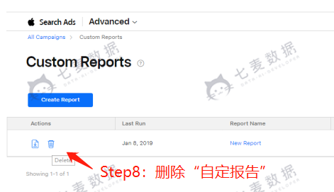 6.若要删除生成的“自定义报告”,可在“自定报告”页面的“操作”列中,点击要删除的报告旁边的“删除”图标。(注:报告一经删除,既永久删除,不可恢复)