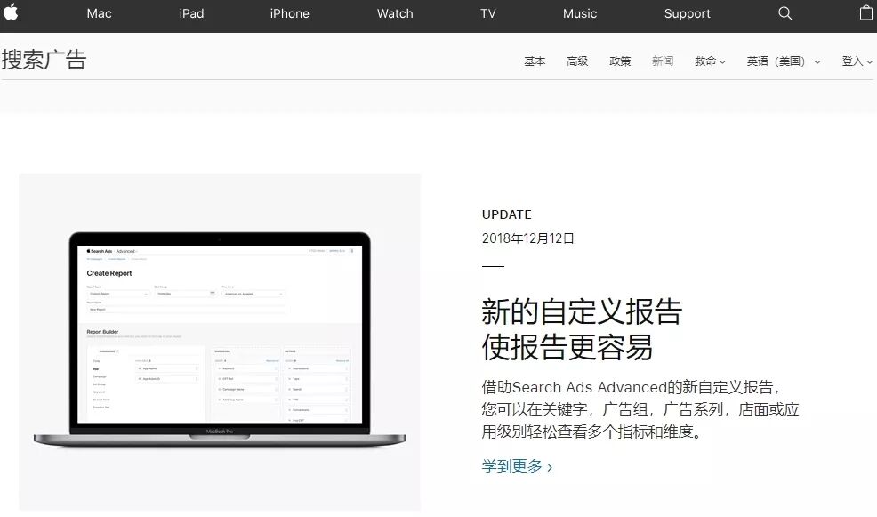 而在上个月的 12 号,苹果更新了一条资讯,在 Search Ads 后台新增了创建自定义报告的相关功能。