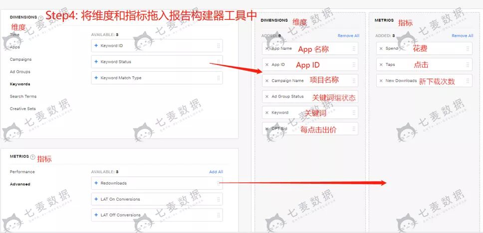 3.接下来,开发者可以自定义报告的展示内容,将左侧需要集中展示的数据维度(Dimensions)和指标(Metrics)拖入右侧报告构建器工具中的相应区域。如下图: