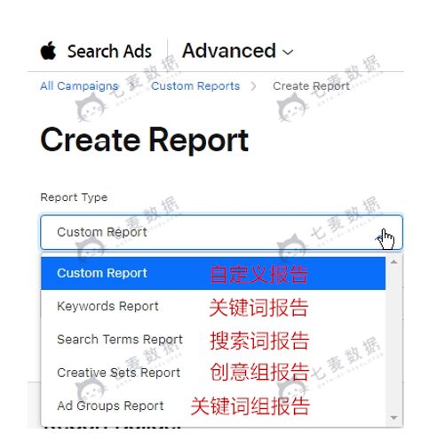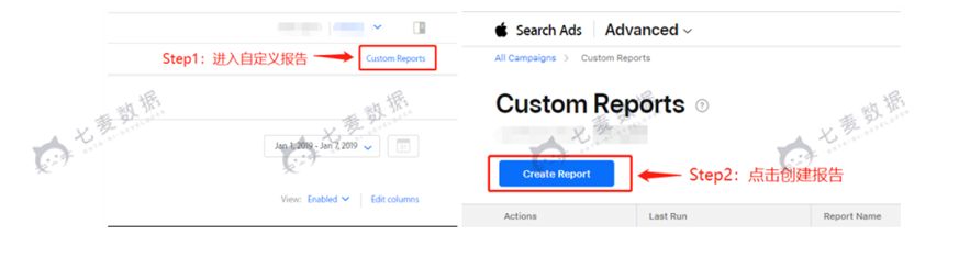 1.在 Search Ads 后台,点击右上角“Custom Reports”(自定义广告),然后点击“Create Report”。(创建广告)