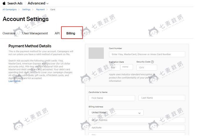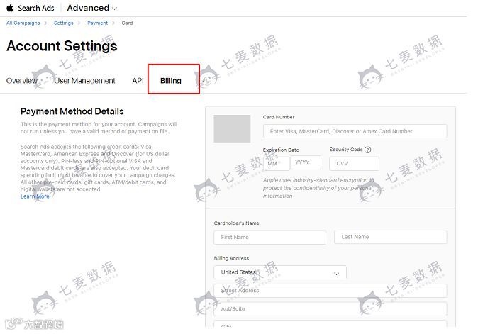 在苹果 Search Ads 里,不管是基础版还是专业版都要求开发商的账号有有效的付款方式,否则广告都不会被正常投放。