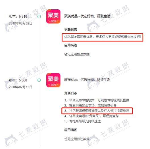 并且在【聚美优品】的版本更新记录当中,可以观测到去年 2 月,【聚美优品】就增加了短视频的玩法,展示位置在产品第三屏中,两者短视频玩法基本一样。这就不难看出,其实【刷宝】是【聚美优品】独立出来的一款短视频产品。