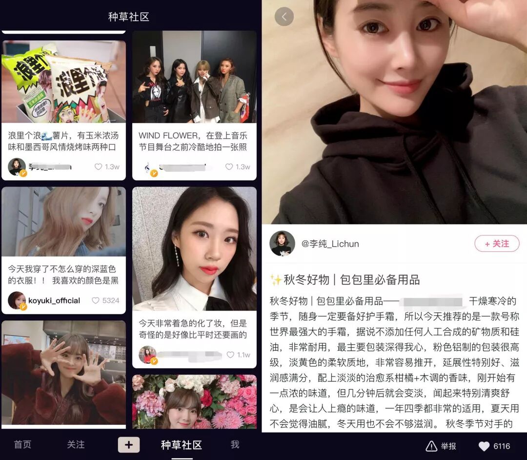 而且这个社区分享板块是独立存在的,即分享内容只能在“种草社区”这个界面中呈现。这种版本的设计还是挺新颖的,但不利于用户寻找某位明星、KOL 的动态。