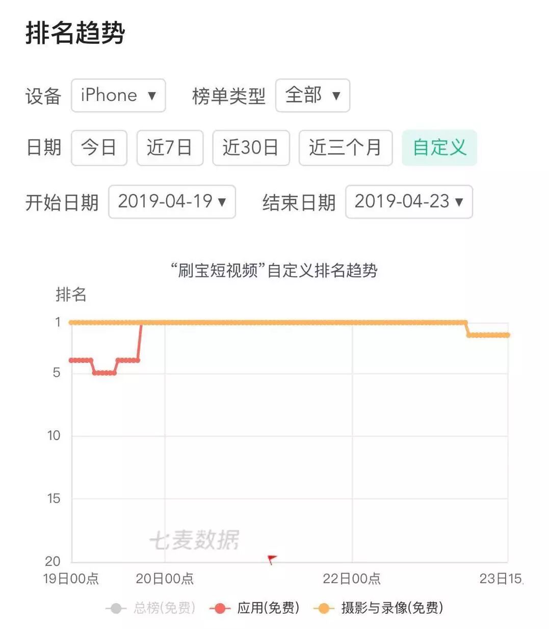 这款名为【刷宝短视频】的产品于今年 4 月 8 日正式上线 App Store。4 月 9 日,摄影与录像榜(免费)排名就冲进 Top70。十天之后,【刷宝短视频】直接挤下【抖音】,成为应用榜(免费)、摄影与录像榜(免费)双项第一。截止至昨日(4 月 22 日),该产品 iOS 端下载量超过 216w,单日最高下载量 42w+。(以下简称:【刷宝】)