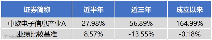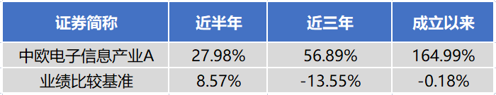 截至2023年3月1日,中欧电子信息产业A过去半年累计回报27.98%,同期业绩比较基准8.57%,上证指数3.44%,在大盘不温不火的行情中,该基金属实实力不俗。