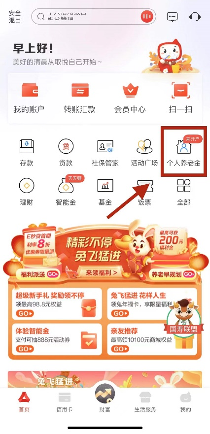 我们整理了中欧财富APP支持开户的6家银行的操作截图,每家银行的流程都大同小异,除了交通银行外都是从首页找到个人养老金专区即可,跟着一起试试吧!
