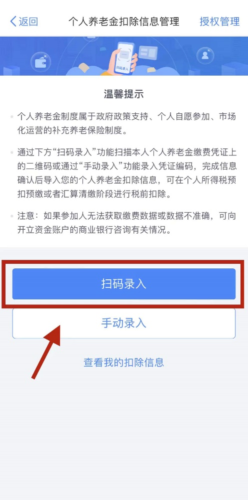 03.扫描刚刚上一步下载的【个人养老金缴费凭证】上的二维码,导入个人养老金扣除信息,即可在预扣预缴或汇算清缴阶段予以扣除。
