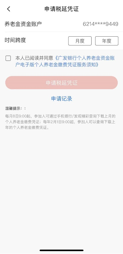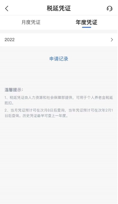 【首页】-【个人养老金】-【税延凭证】-选择【年度/月度凭证】及时间区间