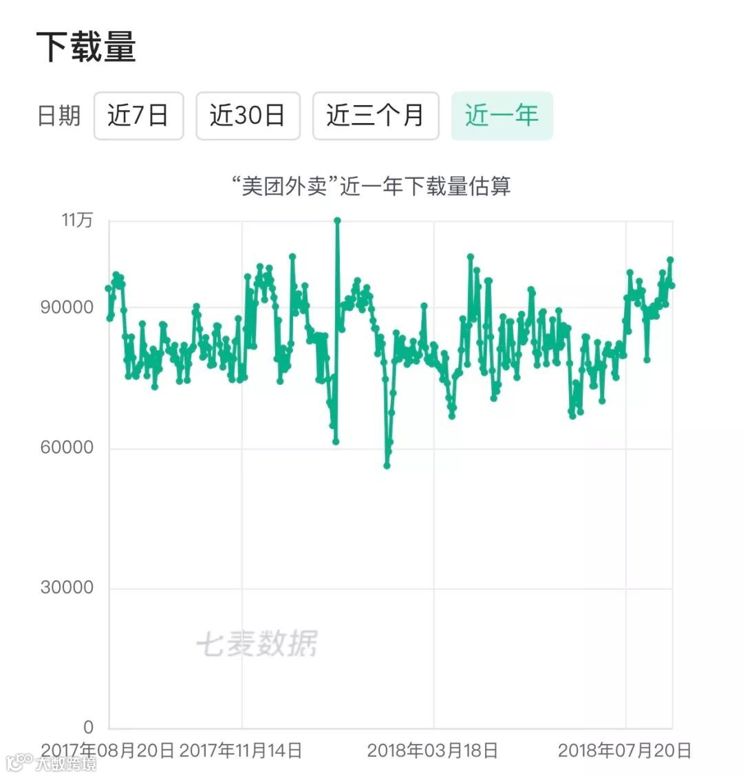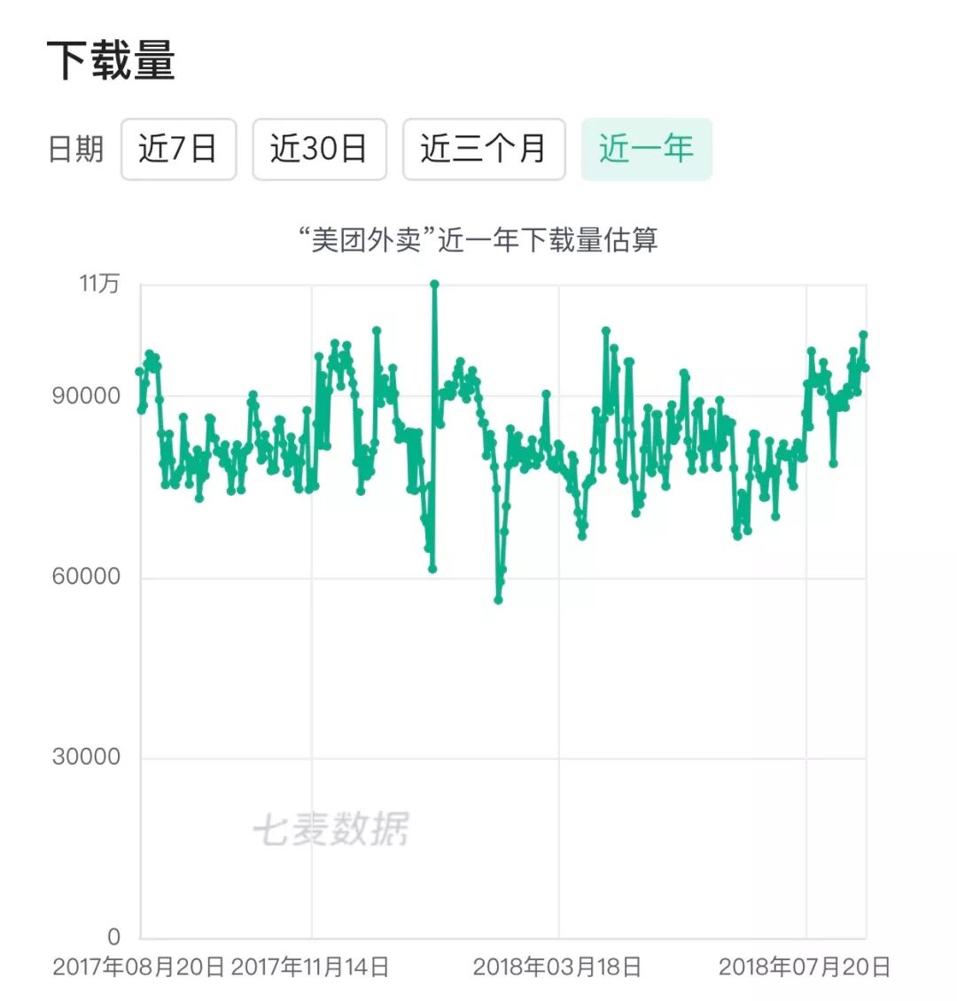 从美团外卖下载量的情况来看,一直趋于稳定状态,就 iOS 市场近一年达到 3000 多万的下载量,表现情况极佳,这样的下载量也使排名第二的饿了么望尘莫及。