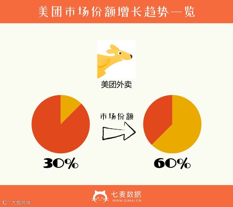 而从美团外卖的市场份额来看,2 年时间其市场份额从最开始的 30% 提升到 60%。