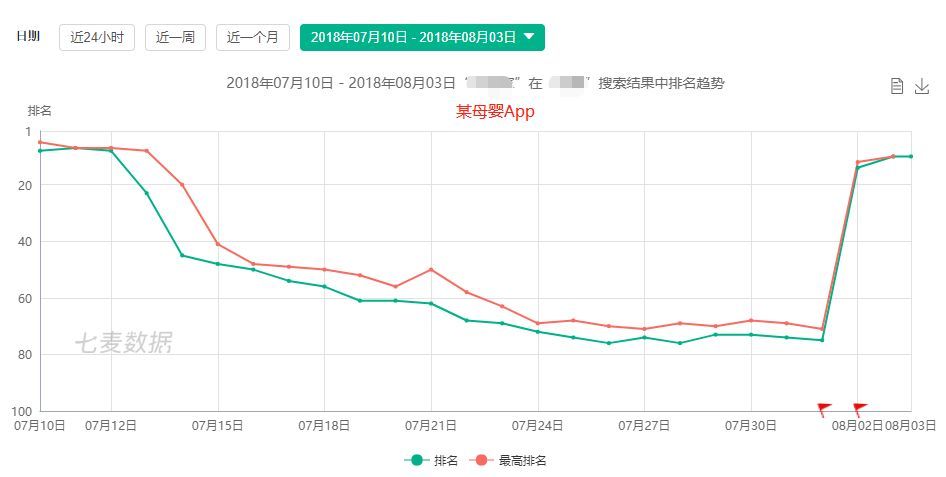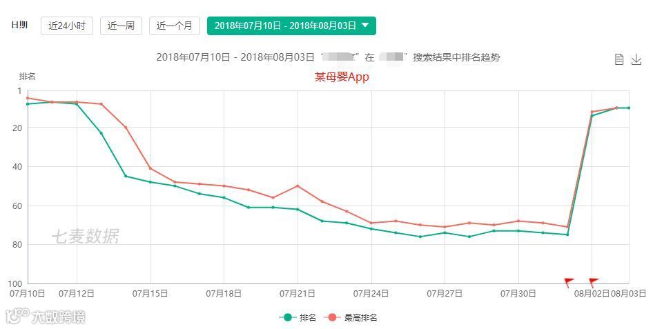 例如,某快递 App,某母婴 App 在 13 日算法调整时,再其关键词搜索下的排名发生大幅度变动,而在 8 月 2 日,算法回调后,排名又恢复到之前的水平。此次算法调整整体上应该是对 7 月 13 日算法调整后的一次回调。