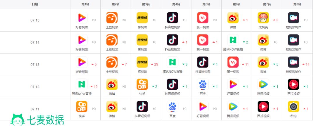 以“短视频”为例,7 月 11 日,“快手”、“抖音”在其关键词搜索排名下纷纷位列 Top3,12 日后名次开始有些许变化。13 日后的几天,“好看视频”、“土豆视频”、“捞视频”等标题中带有【视频】关键词,跻身前三名。而“快手”则跌出十名开外。