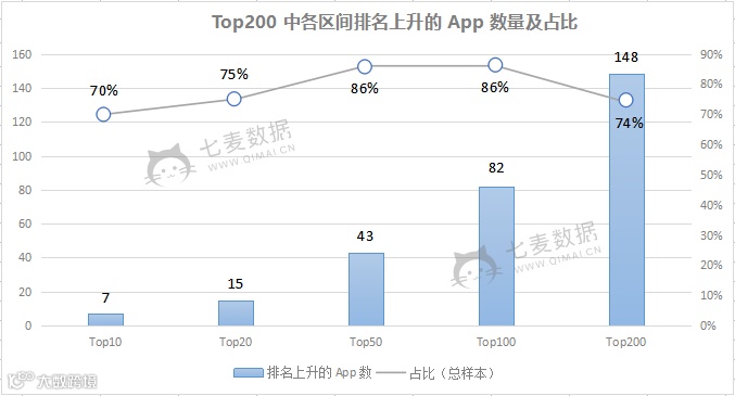 针对这一现象,七麦数据选取了 App Store 总榜(免费)Top200 的 App 作为分析数据的样本,做了一次深层次分析。如下方图表所示: