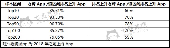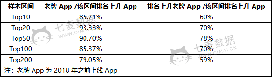 在 Top10 至 Top200 这 5 个区间内, App 排名上升的比例最低为 79.05%,最高为 93.33%。而相对应的这些排名上升的 App 中为老牌 App 的占比最低为 59%,最高 78%。
