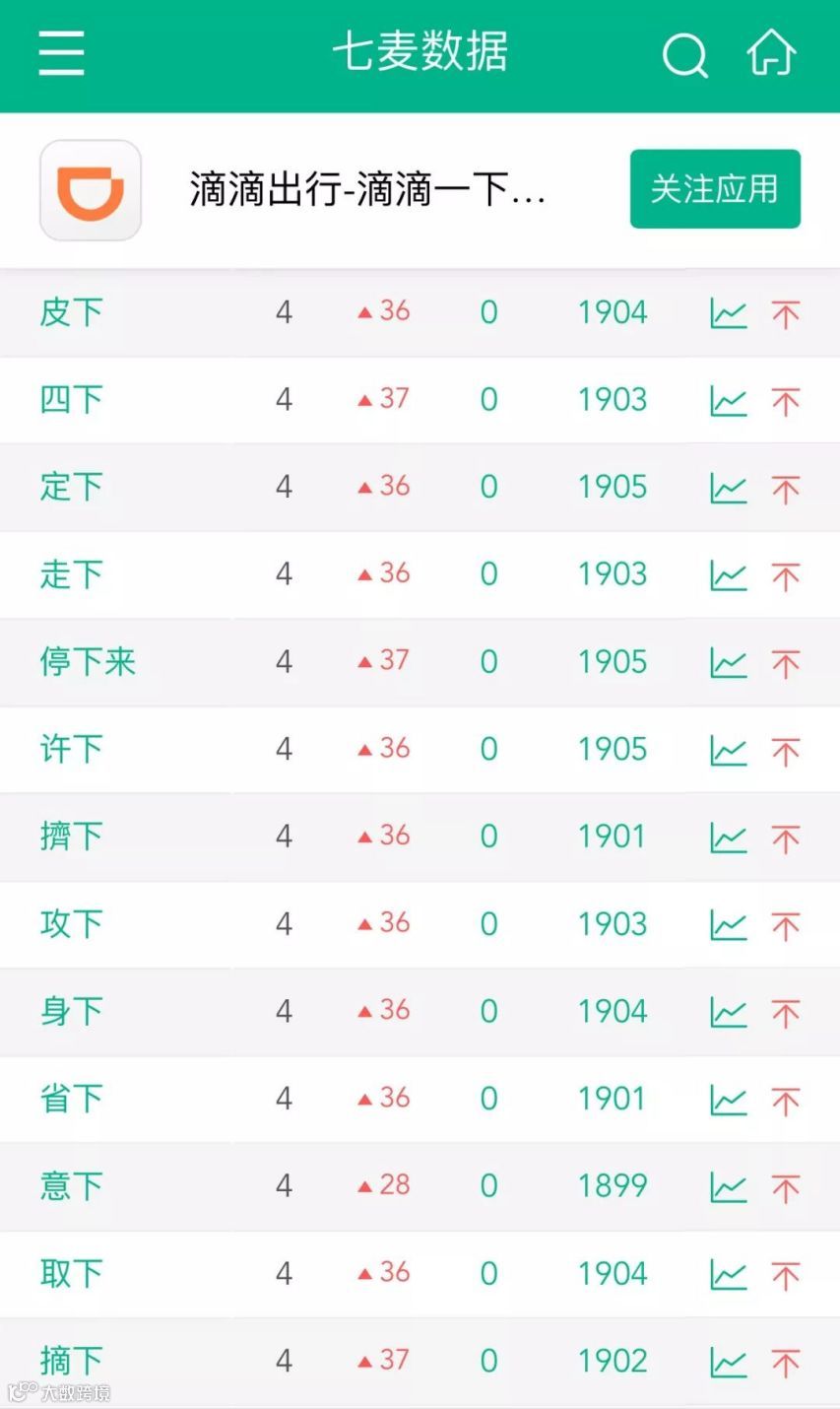 排名上升涉及部分“无关词”,不仅热度不高(搜索指数在 4605 以下,甚至 0 ),鲜有搜索次数,且与产品本身的相关度极低。如「滴滴出行」的副标题为“滴滴一下,美好出行”,在该 App 搜索结果排名上升的关键词中,存在大量带有“下”字的关键词,如“等而下之”、“流下”、“目下”、“年下”、“寄人篱下”、“上下铺”、“阁下”、“水下探秘”等,且上升后搜索结果排名高至 Top5。