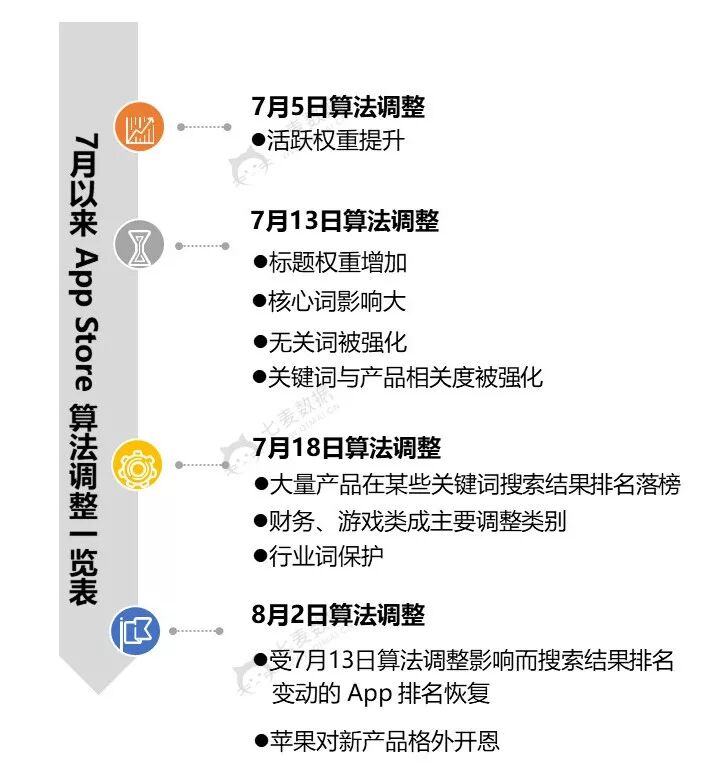 7 月以来,苹果算法调整十分频繁,榜单排名及关键词搜索排名均有大幅震荡,其间还涉及算法回调,让开发者们一脸懵逼。为了让大家清楚的了解调整始末及现状,今天重新回顾下 7 月以来苹果算法调整的具体情况,并为大家给出相应的应对策略。