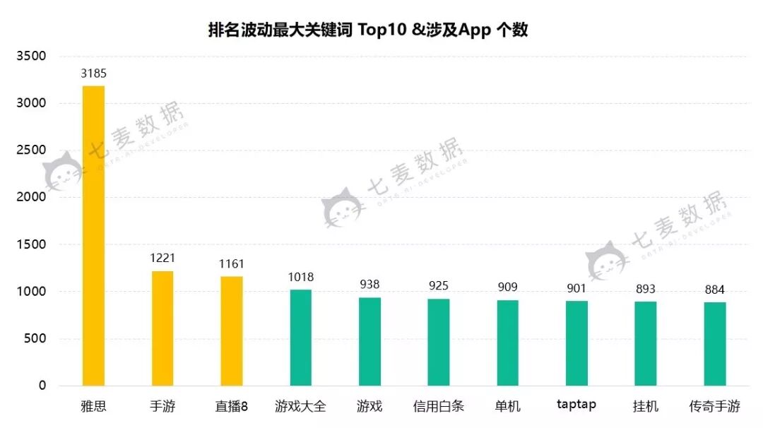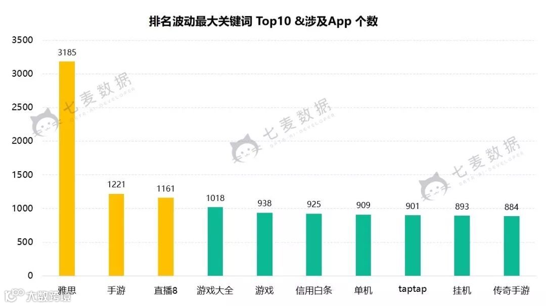 像:“雅思”、“旅行青蛙”、“武侠”、“小说阅读”、“全民直播”等行业词可能由于苹果正在对其进行行业词保护,避免恶意竞争,而导致这些词下面的搜索结果排名大幅下跌,甚至落榜;像:“VPN”、“竞彩”等则可能由于苹果对敏感词进行清理,因此,这些词下面的搜索结果排名同样不会很高。