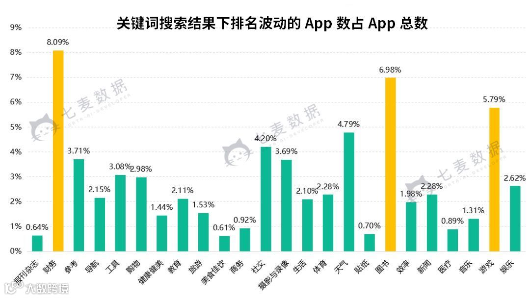 一款财务类的 App 下,搜索结果排名波动的关键词最多,共计 259 个,占比 8.09%。
