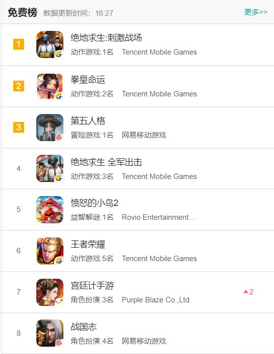 近几天《拳皇命运》在各项榜单上的排名均有所下滑,让出了总榜和游戏榜第一的宝座,看来苹果官方和广大玩家也不傻,“刷图、抽卡、PK”这样一款模式化的游戏短期内能依靠 IP 获取流量,但是是无法得到大家的长期认可,在流量狂欢过后,《拳皇命运》的“命运”,很有可能是一次大范围的排名下跌。