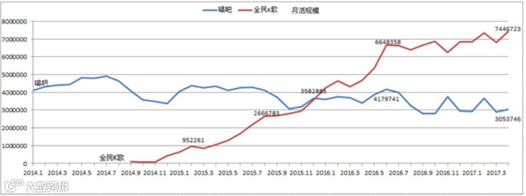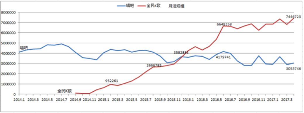 然而, 2016 年开始后,一颗冉冉新星崛起,全民 K 歌从零基础猛增到 700 多万,远远赶超唱吧。