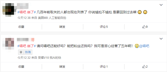 目前,该条搜索共有三千多万的阅读量。不仅微博上哀嚎一片,很多唱吧用户也跑到了应用商店 App 底下去评价吐槽。