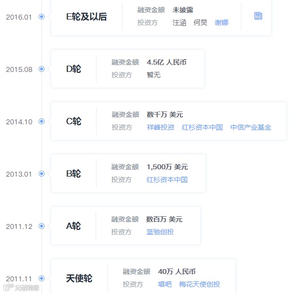 相信细心的朋友能看到,2016 年 1 月,E 轮后的融资是由著名的湖南卫视主持人汪涵、何炅、谢娜所投。据了解,此次的投资三位艺人是以少量现金+形象代言折合现金的形式 入股。
