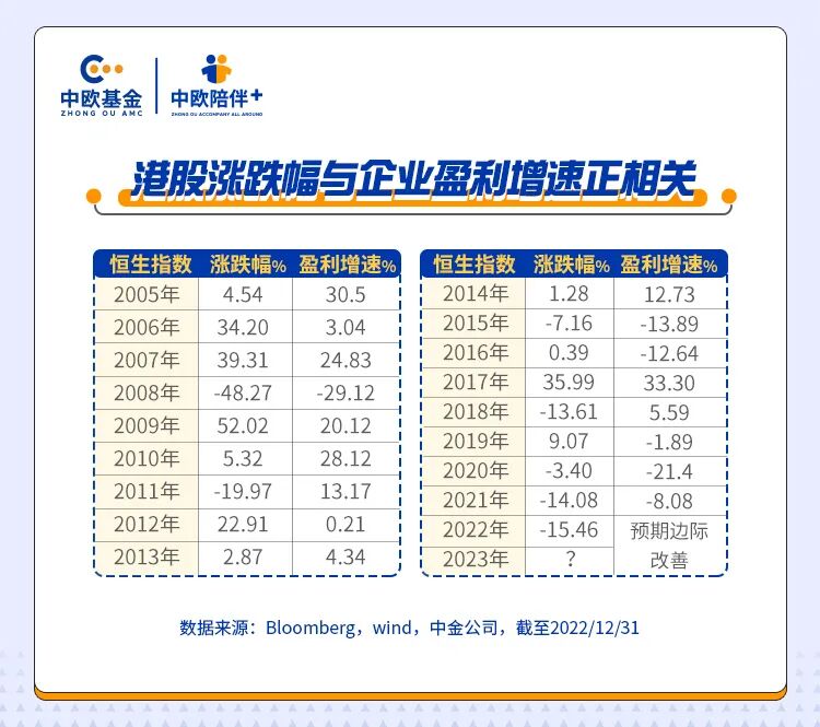 结合恒生指数历年涨跌幅以及盈利增速数据来看,每一次盈利预期的向上修正都给市场带来指数级别的机会。当前伴随疫情缓解与经济复苏,优质公司盈利增速有望显著改善,从而驱动股价上涨。