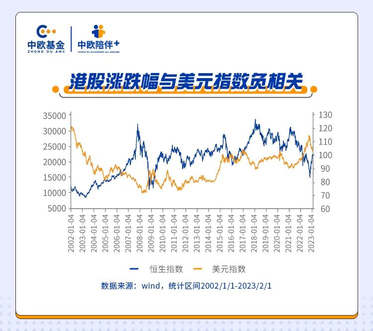 就像前文提到的,港股也要关注全球的流动性,它与美元指数之间在一定程度上存在负相关关系。即在美元走强的时候,全球资本会从新兴市场流向发达国家市场,因此造成港股市场的资金外流。如2011年恒指下跌19.97%;反之如2017年美元回调,恒指上涨35.99%,其中很多个股甚至上涨了几倍。