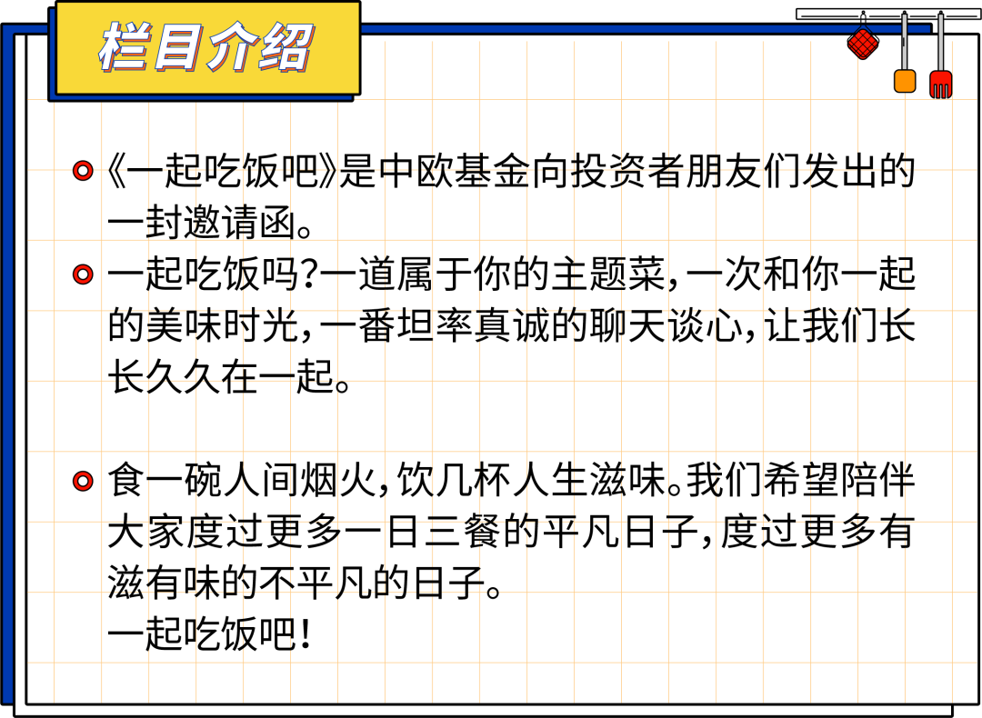 新友相约,举杯共食。如果把投资比作一道菜,你觉得会是什么呢?带着这样的疑问,我们的新栏目《一起吃饭吧》正式营业!