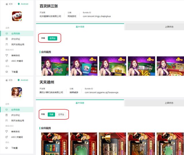 相比苹果小心谨慎的审核态度,安卓市场上显得大刀阔斧些。由于安卓市场情况较为复杂,目前只有少数德州类 App 主要留存于应用宝、百度市场上,其他市场已经不见踪影。