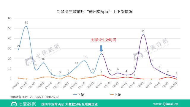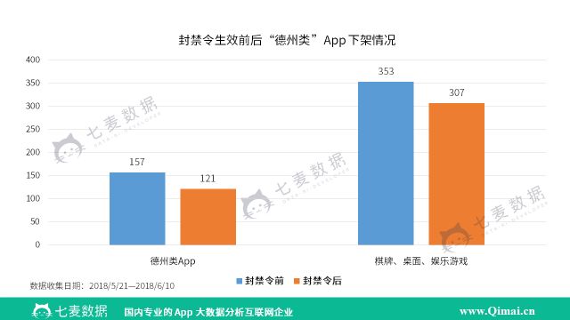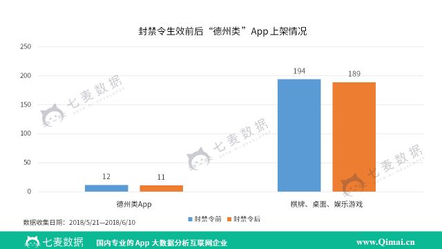 眼看过去十多天了,这条禁令到底有没有发挥作用? 为此,七麦研究院重新收集相关数据,对德州类 App 在封禁令生效前后时间段内的上下架情况进行整理,分析如下: